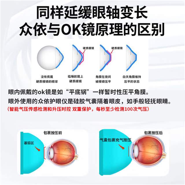 夜间选用【体外柔性角膜塑形(OK)镜】模式:特制硅胶气囊,通过有节律的充放气,在睡眠中暂时压平外凸的角膜,延缓度数加深速度。